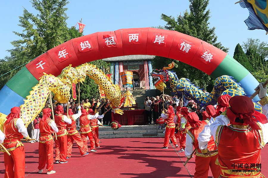 长岛县民组织舞龙表演,恭送庙岛千年金身妈祖分身赴台结缘会亲。(中国台湾网 何建峰 摄)