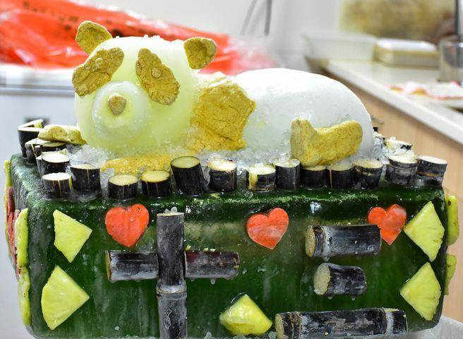 “团团”的蛋糕以方型为主,保育员用窝窝头及碎冰制作了“团团”的肖像。(图片来源:台湾“中时电子报”)