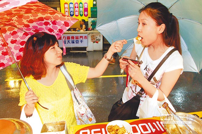 来自北京的游客到淡水老街逛街,一边吃小吃,一边忙着拍照。(台湾《旺报》)