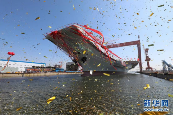 2017年4月26日,我国第二艘航空母舰下水仪式在中国船舶重工集团公司大连造船厂举行。图为航空母舰下水仪式现场。
