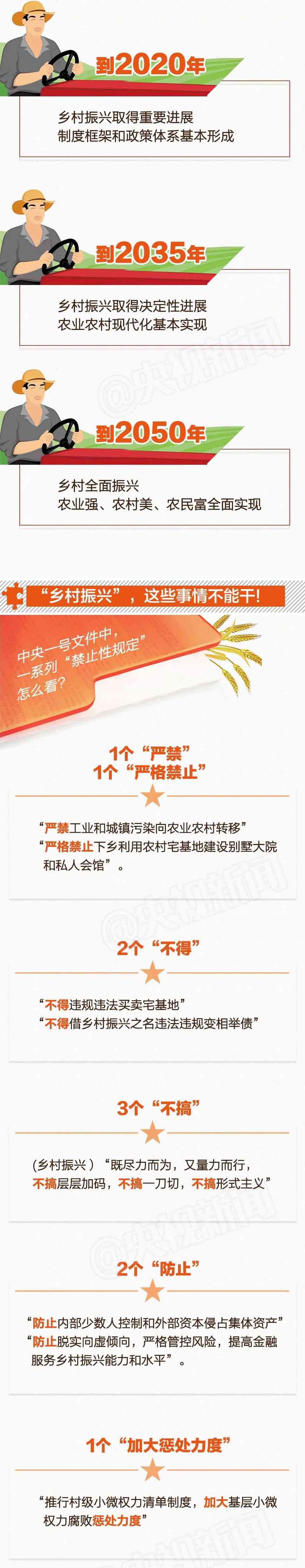 《意见》是对十九大“乡村振兴”这个全新提法的系统性表述。什么叫“乡村振兴”?怎么干?要达到何种目标?什么样的标准才称得上“乡村振兴”?此外,这份文件中还有一系列“禁止性规定”,哪些事情不能干,哪些是被禁止的,哪些会被严厉处罚?一图读懂↓