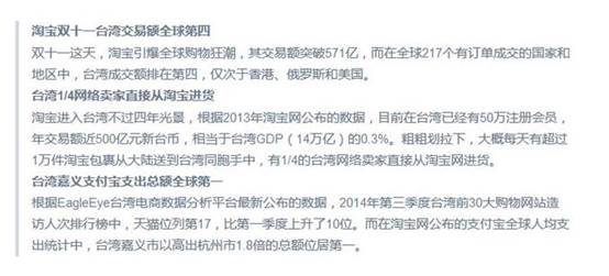 先拿最简单的网购来说:当某宝刚刚进入到台湾省时,不论是人性化的购物体验还是精细化分的购物选择,都比台湾当地充斥着乱七八糟广告的网购平台强很多,但有些台湾同胞们嘴上说着不要,可身体却很诚实的在某宝上疯狂网购。