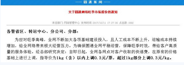 媒体报道的,圆通早前挂出的涨价通知