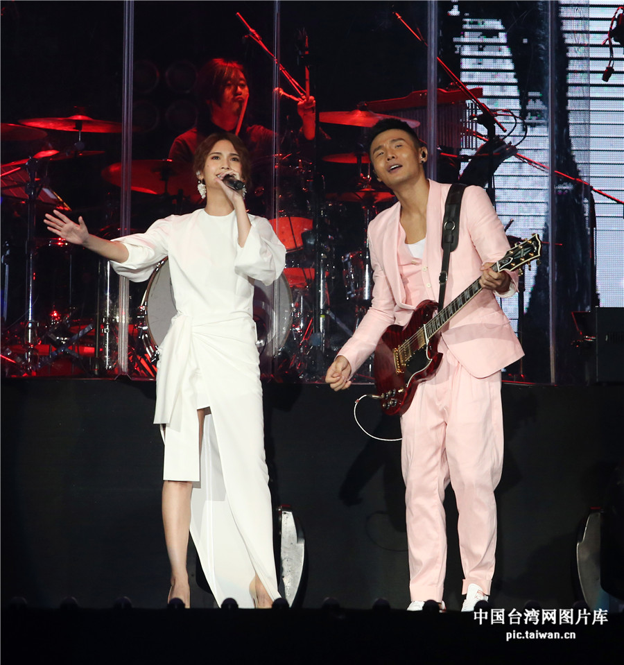 李荣浩在台北小巨蛋开演唱会,趁女友杨丞琳不注意时给了深情一吻。(图片来源:中国台湾网图片库 摄影:黃威彬)
