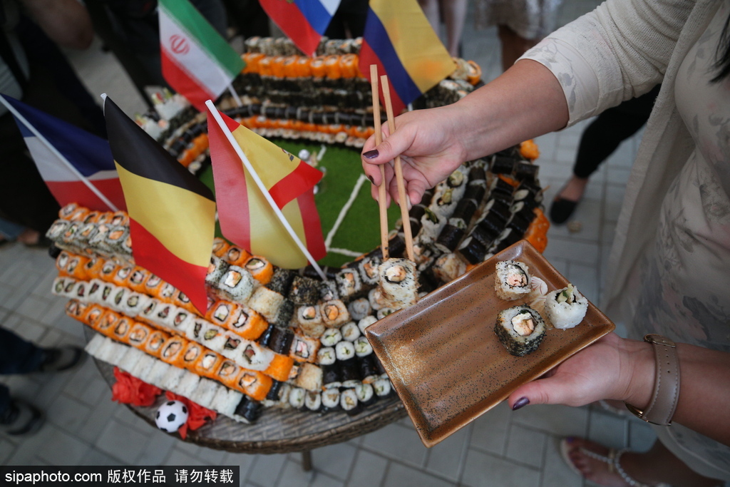 当地时间2018年7月5日,俄罗斯喀山,Yakitoriya餐厅推出一款寿司球场,迎接俄罗斯世界杯1/4决赛俄罗斯VS克罗地亚。据悉,这款球场共使用了6000个寿司,重达85kg。