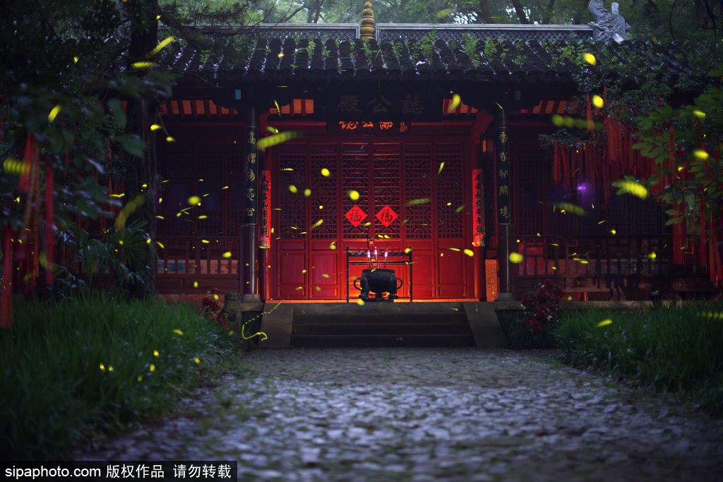 2018年7月8日,南京,夜晚时分,成群的萤火虫在南京紫金山灵谷寺公园的树林中飞舞,星星点点的亮光宛如夜空中的繁星,仿佛成了一个奇幻的精灵世界。在国内很多地方,萤火虫急剧消退,许多人儿时记忆中的萤火世界,日渐成为回忆,而南京灵谷寺却是全国范围内这些小精灵在城市中保留最好的地点之一,被称为萤火虫天堂。