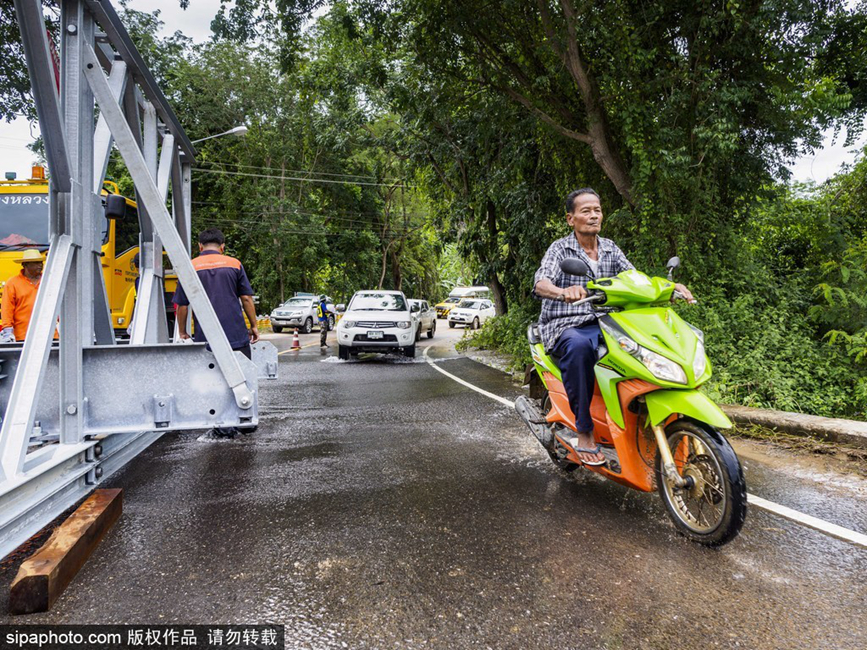 当地时间2018年8月9日,泰国碧武里,泰国皇家海军的船只排成纵队穿过菲恰布里河,海军使用船上的螺旋桨在洪水发生时将洪水推到下游。这些船只被预先安置在河上,因为预计本周洪水会来袭。菲恰布里河从Kaeng Krachan水坝流入暹罗湾,流经几个城镇。政府官员警告这些城镇的居民说,他们的城镇将会被洪水淹没,因为大坝后面的水库的容量正在接近饱和。
