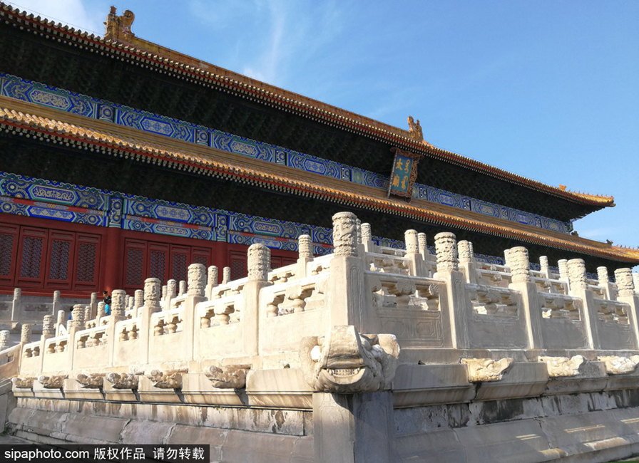 2018年8月16日,北京,北京劳动人民文化宫,太庙600岁螭头“长蛀牙”。 “这些神兽该洗牙了!”参观太庙过程中,游客对建筑上的神兽开起了玩笑。近日有市民反映,太庙建筑上的大多数兽头牙齿发黑,好似患了“蛀牙”。专家判断,石兽牙齿发黑多与自然因素影响有关,但不能随意清洗。