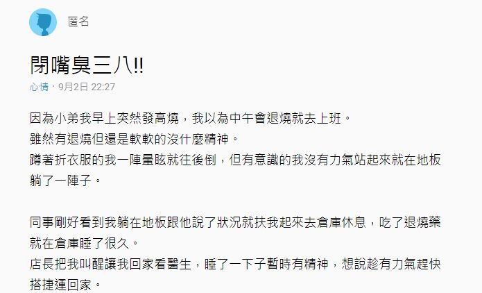 据台湾“东森新闻云”报道,一青年近日在台湾的社交媒体上表示,自己当天早上突然发高烧,本以为中午就能退烧所以照常去上班,结果却在工作中突然晕眩倒地全身都没有力气。后来看完医生后搭捷运回家,有人看他身体不舒服便让座给他,有了座位的他还在车上小睡了一阵子。