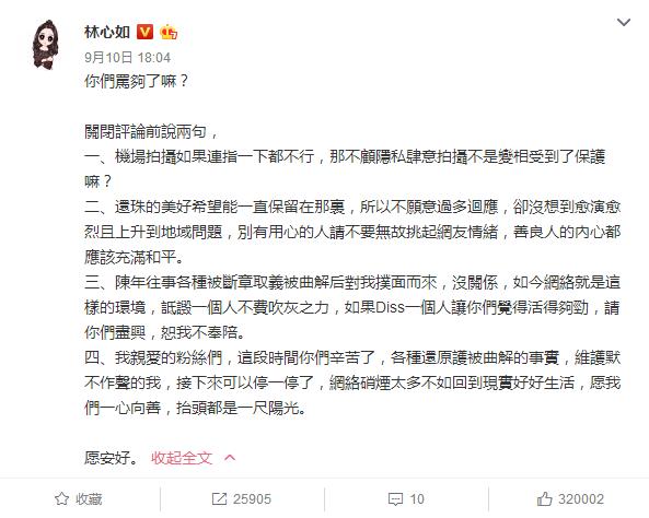 从2013年到2017年这条旧闻就跟被策划好了一样一遍遍翻新炒作,这得是有多大仇多大怨才能如此坚持不懈年年黑?时隔十多年,周杰终于忍不了而澄清了。9月6日,周杰发微博怒怼林心如,并扯上两岸话题,称林心如在台湾节目恶意诋毁大陆人。