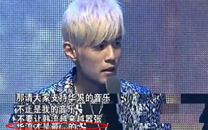 再比如,周杰伦在2012年4月全球华语榜中榜颁奖典礼上领奖时说“希望所有的歌手可以团结起来,因为华人的音乐是最屌的”;同年12月的百度沸点庆典上,狂揽3项年度大奖的周董依旧不改力挺民族文化的本色,公开“叫嚣”韩流:“不要让韩流越来越嚣张,华流才是最屌的。”