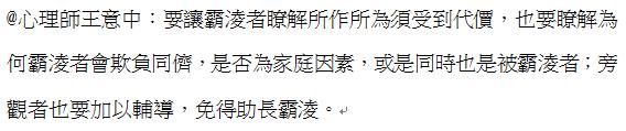 台湾某初中的前校长称:“学校老师发现霸凌事件,是否要跟家长说,必须看情况,家长有时是助力,也可能是阻力。家长本身可能就是问题制造者,以此情况,老师并不适合立刻跟家长沟通,但如果家长很明理,就可以敞开来谈。”