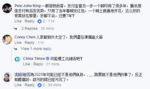 有台湾网友指民进党的“非核家园”也订在2025年,讽刺其除了会开“空头支票”外什么都不会做;更有人嘲讽道“我真等到花儿也谢了!大陆现在都快普及了,台湾还要等这么多年,政客们简直是在尸位素餐”;还有岛内网友感叹:听说大陆都可以“刷脸支付”了,我们却还在为移动支付争论不休,台湾的发展机会就这样白白浪费掉。