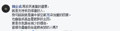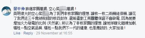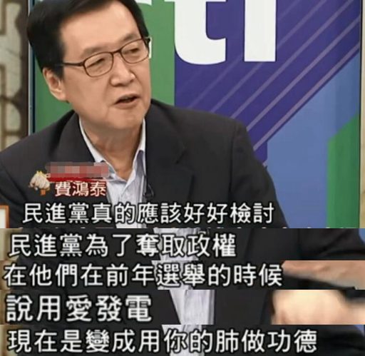 知名政论评论人费鸿泰也表示,民进党真的应该好好检讨下,选举时说好的“用爱发电”,如今却变成“用肺做功德”。
