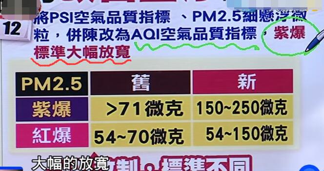 虽然“环保署长”煞有其事的立下了“军令状”,但其实人家早已将标准调整了:原本空气质量指针(AQI)超过70毫克就是“紫爆”,但修改过后标准变成超过150毫克才是“紫爆”,“红爆”也从70微克的上限放宽到了150微克。如此看来,台中市“紫爆”天数从去年的99天变成了今年的19天,还真是不奇怪了。有台媒调侃到:就算明年不幸险些就要超过20%了,那再下调标准不就好了;还讽刺说“环保署长”应该在一开始时就称要调降50%的目标,这样会更感人。