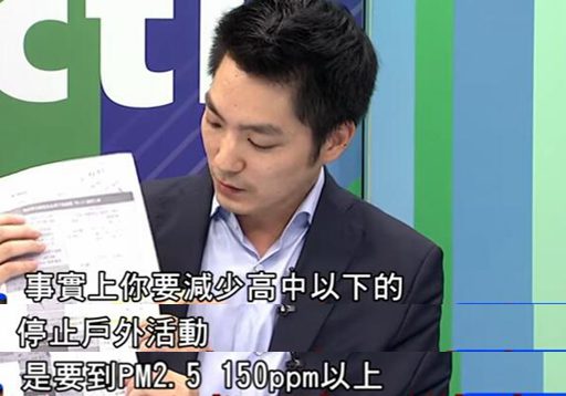 对此,国民党“立委”蒋万安也向“环保署长”提出质疑,但得到的却是对方自相矛盾的说法,“我问他,就前两天的情况看,你会不会鼓励民众减少外出?他说当然会。然而实际上环保部门定的管制措施上却规定,要减少高中以下的户外活动,PM2.5是要到150ppm以上才可以。也就是说,要达到修改后的空污‘紫爆’标准才可以,这根本是自相矛盾”。