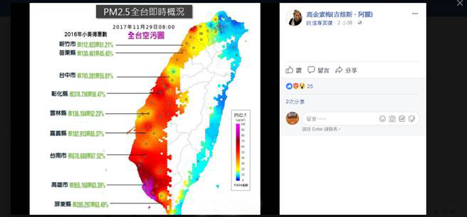 高金素梅1日在脸书网上贴出了张全台空气污染图,并标注出了2016年台湾地区领导人选举时,当选者蔡英文在岛内一些县市的得票数,结果竟得出了一个惊人的结论:几乎是越挺蔡英文的地方,污染就越严重。