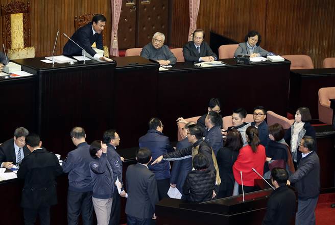 “立法院”9日临时会处理“劳基法”部分条文修正草案,‘院长'苏嘉全(上)进入议场后宣布进入广泛讨论,遭国民党团上前抗议。(图片来源:台湾《中时电子报》)