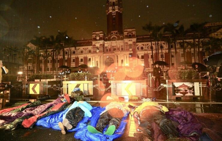 事情要从5日的临时会之后说起:当民进党“立委”夜宿“立法院”以确保周一(8日)能优先送案时,“时代力量主席”黄国昌也率自家“立委”彻夜在蔡办前的凯道上搭帐篷开始了静坐禁食抗议行动!