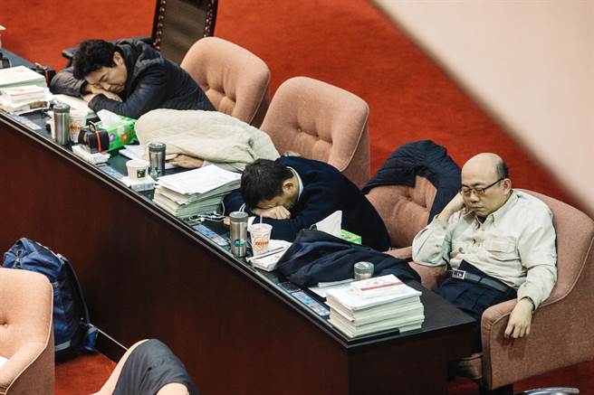 台“立法院”彻夜审“劳基法”,有“立委”抵抗不了浓浓睡意,在底下睡成一团。(图片来源:台湾《中时电子报》)