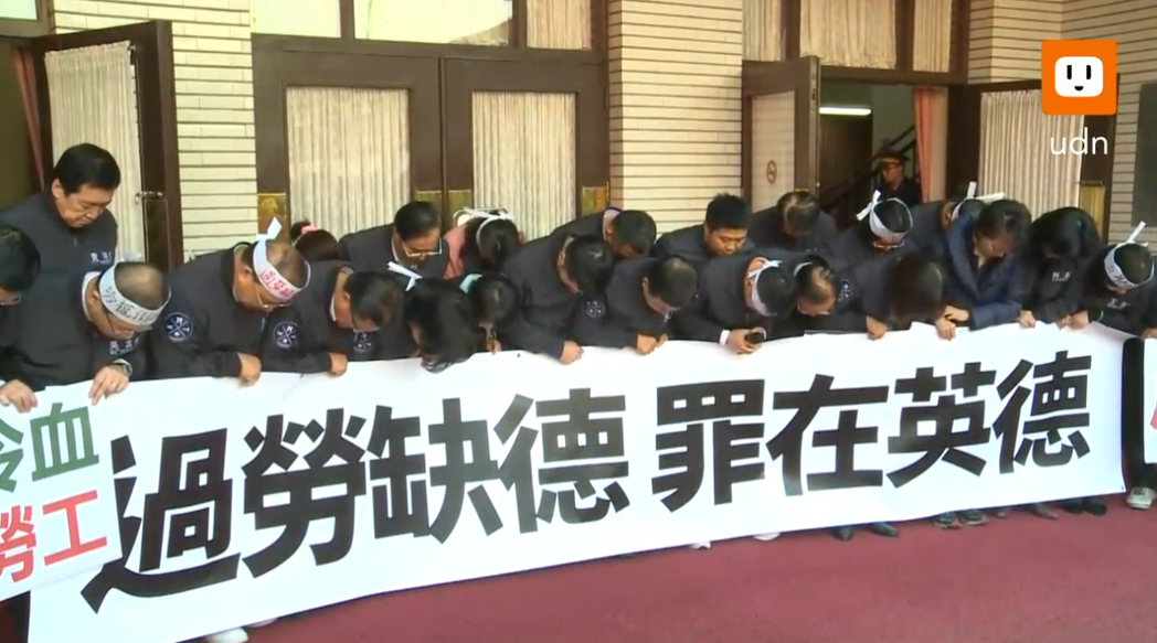 国民党团在会后向劳工朋友鞠躬道歉,表示已经尽力了。(图片来源:台湾“联合新闻网”)