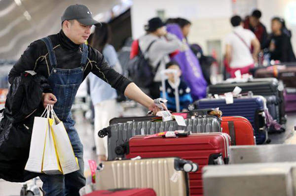 吴斯怀指出,蔡英文是吃了秤砣铁了心,连台湾人最在意的春节团圆,都可以弃台商于不顾。图为1名搭乘东方航空的旅客在桃园机场领取行李。(图片来源:台湾《中时电子报》)