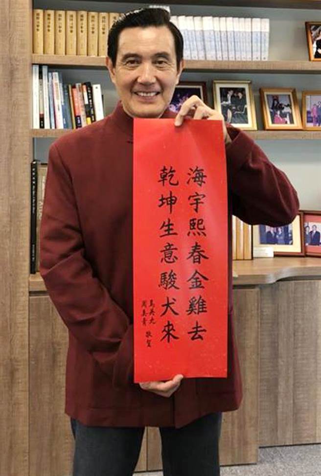 马英九亲笔狗年春联,“海宇熙春金鸡去,乾坤生意骏犬来”,还有妻子周美青双重祝福。(图片来源:台湾《中时电子报》)