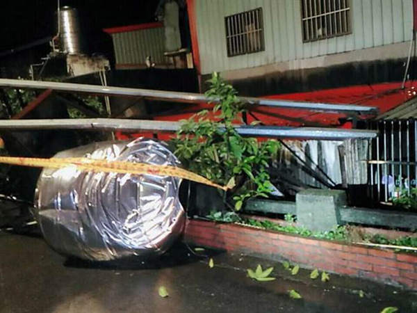 台湾东部海域4日晚间发生多起有感地震,新北市莺歌区国际二路路边搭建的2吨水塔,疑因地震横倒在小巷内。(图片来源:台湾《中时电子报》)