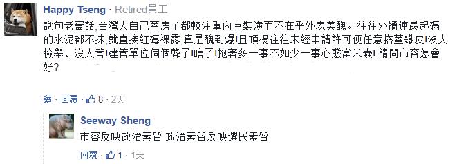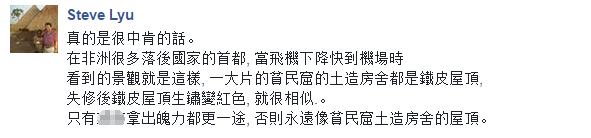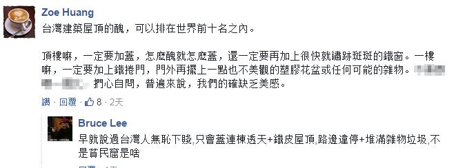 反之,一些台湾小伙伴倒觉得这样的评价很“中肯”,其中最为人诟病的当属违建不断的铁皮屋顶,“非洲很多落后地区就是这样的景象,一大片的贫民窟都是铁皮屋顶”、“顶楼都是未经许可便可随意搭盖的铁皮,监管部门都睁一只眼闭一只眼”、“市容反映政治素质,政治素质反应选民素质”。