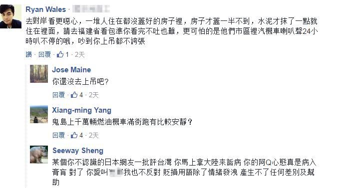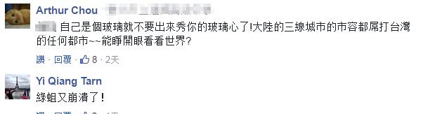 据台湾“东森新闻云”早前报道,一网友发文问面对大陆人评价“台湾的路都那么小条,房子又破,简直就是‘贫民窟’”时该如何回击,结果不少人的帮腔“献策”,“北京还有厕所没门儿呢”、“马路上到处都是屎和尿”、“胡同比台湾巷子更小,但却是北京人的骄傲呢”、“是没来过高雄吧?少见多怪”……