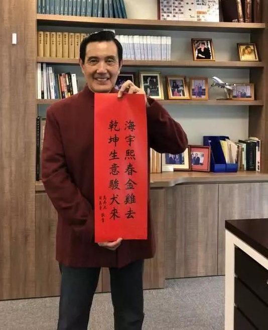 据报道,马英九日前前往台南市议员林燕祝服务处,现场挥毫,送出3幅“狗年旺旺 财源滚滚”春联,当时就吸引不少民众询问,今年正式版的自制春联“海宇熙春金鸡去 乾坤生意骏犬来”一推出,10万份一天就被抢光,目前共加印22万份,在66处发放点重新“上架”,以供民众免费索取。