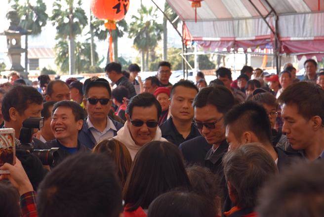 台湾地区前领导人马英九(白衣者)17日至新竹县义民庙上香、赠春联,人气不减。(图片来源:台湾“中时电子报”)