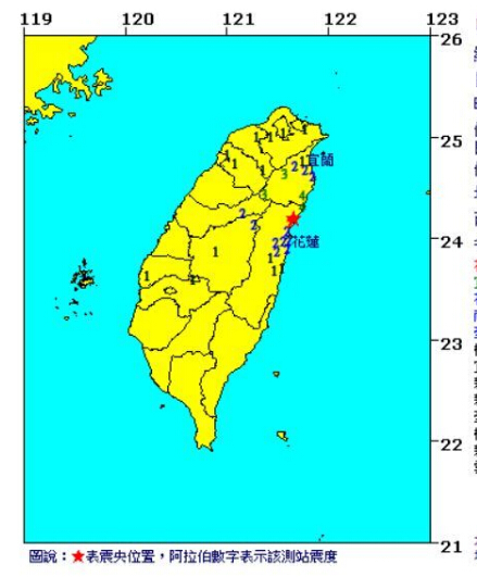 各地最大震度:花莲县太鲁阁5级、宜兰县南澳4级、花莲县花莲市2级、南投县合欢山2级、台中市德基2级。(中国台湾网 李宁)
