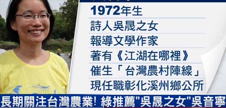而她的父亲吴晟是台湾乡土文学作家,创作以新诗为主、散文为辅,写作之余亦从事农事,2017年被蔡英文办公室聘任为“资政”。