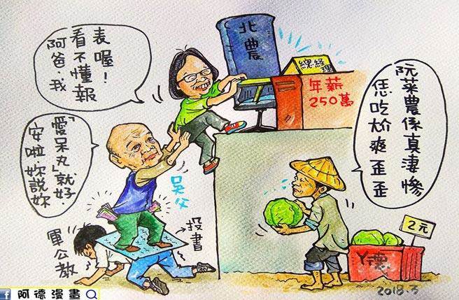 对此,有网友贴出一张插画狂酸。据《中时电子报》报道,画中“吴父”踩着跪在地上的军公教,将女儿推上年薪250万的北农总经理位置,女儿说“阿爸,我看不懂报表喔”,阿爸则回她“安啦!你说你‘爱呆丸’就好…”;而一旁手捧2元高丽菜的农民则在飙泪。网友纷纷留言,“老爸干掉军公教,女儿干倒果菜农,一门豪杰!”“资历不可靠,买衣服选绿色的就对了!”