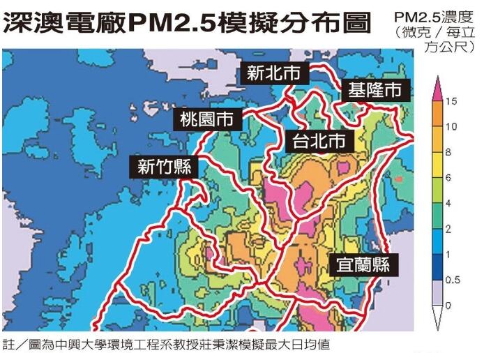 庄秉洁的模拟结果指明,深澳电厂PM2.5日平均增量高达6.075μg/m3,此数据可是台电环境差异分析报告书中模拟值1.933的3倍以上,且宜兰县及桃园市的污染量日平均增量居然比新北市还高!