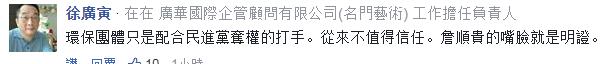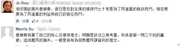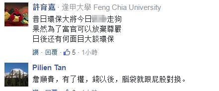 上了台就变了脸,当了官就黑了心!火眼金睛的台湾网友们一语道出真相,“所谓‘环保斗士’,当初是为民进党执政而斗,如今是为了民进党利益与自己的官位而斗”、“詹顺贵有了钱权之后,脑袋和屁股就对换了”。