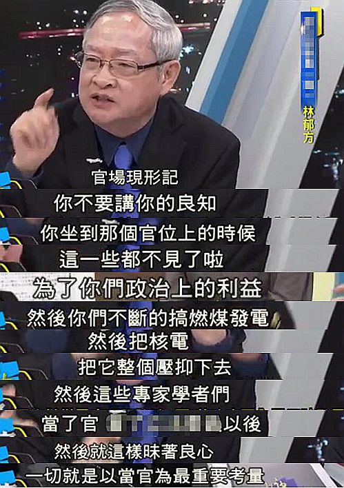 前“立委”林郁方更痛心疾首的表示,他看到了现实版的“官场现形记”,痛批蔡英文当局“为了政治上的利益”不断靠燃煤发电;林也狠戳台湾所谓专家、学者的脊梁骨,“当了官以后就昧着良心,一切以当官为最重要考量”!