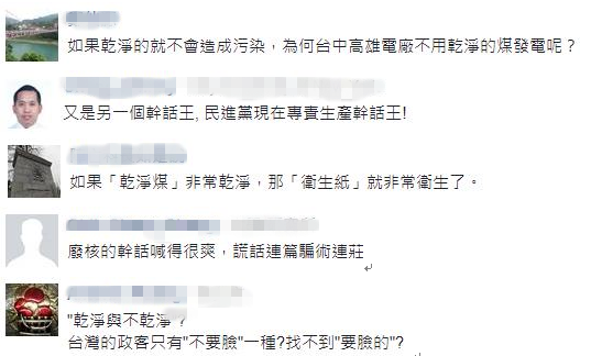 面对外界的批评和质疑,台“行政院”发言人徐国勇18日接受媒体访问时表示,燃煤仍然是现阶段其他国家和地区采用的发电方式,并强调真的有干净的煤,不是赖清德发明的名词,建议大家google一下。现在高质量的煤,如无烟煤,经过技术去化污染,排放污染量可比燃气发电。他还指出, 台湾不能说不要这些电厂、不要这些机组,可是又要用电,这是相当矛盾的。