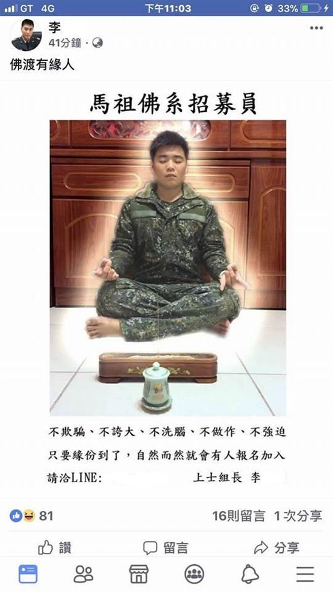 女士官能打美女牌,男士官当然也有自己的怪招。据台湾《中时电子报》报道,有一位在马祖服役的军人在脸谱网贴出合成照片,为一穿着迷彩服的军人在一香案前打坐,打出“马祖佛系招募员”,号称“佛渡有缘人”,“不欺骗、不夸大、不洗脑、不做作、不强迫”,“只要缘份到了,自然而然就会有人报名加入”,并附上Line的账号,堪称台军另类招募奇招。