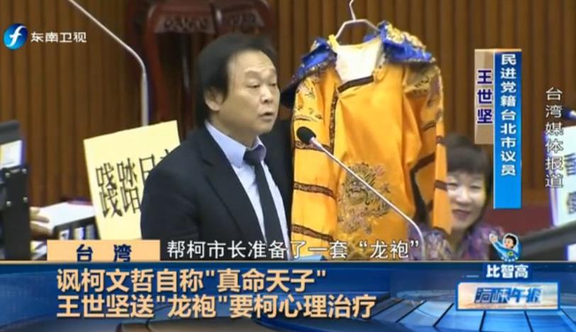 王世坚与柯文哲互怼早不止一两次,情绪激动的王世坚也是不断闹出笑话。据东南卫视报道,柯文哲10日赴议会施政报告,王世坚拿出“龙袍”“龙帽”,说要送给自称“真命天子”的柯文哲,引起全场哄堂大笑。王世坚说:“帮柯市长准备了一套‘龙袍’,让柯市长私下在办公室或在家里可以穿上它过过瘾,这也算是一种心理治疗”。他还劝说柯文哲,“送给自称‘真命天子’的你,你就别客气了,收下吧。”