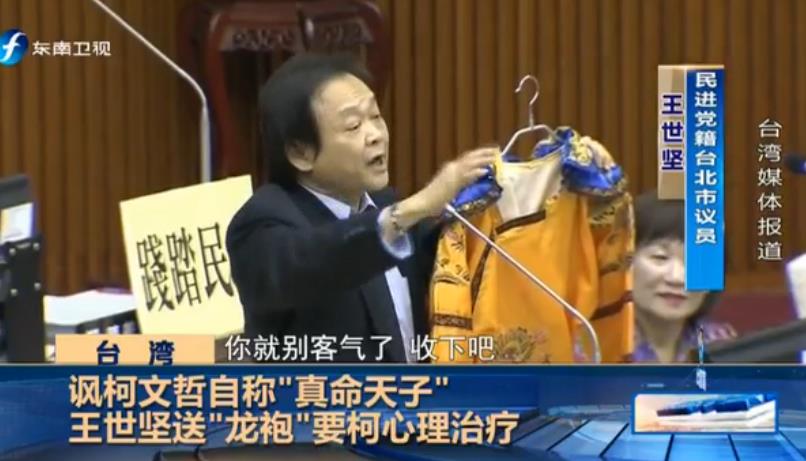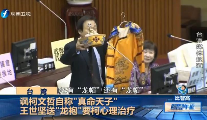 王世坚送柯文哲龙袍。(图片截取自东南卫视视频)