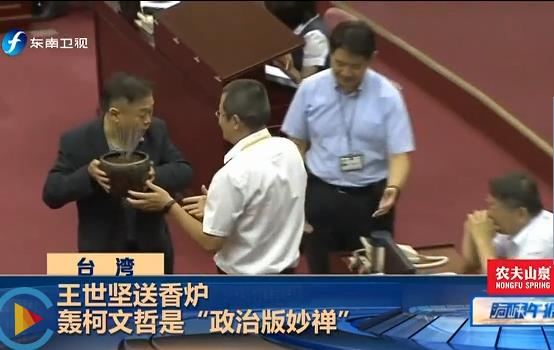 除了送龙袍、送书,王世坚还送香炉给柯文哲,并“赠与”柯文哲“政治版妙婵”的新封号。王世坚称柯文哲把自己神格化、把自己供在神坛,“真是政治版的妙婵”。面对王世坚送香炉,柯文哲则赶紧叫人把它拿走。