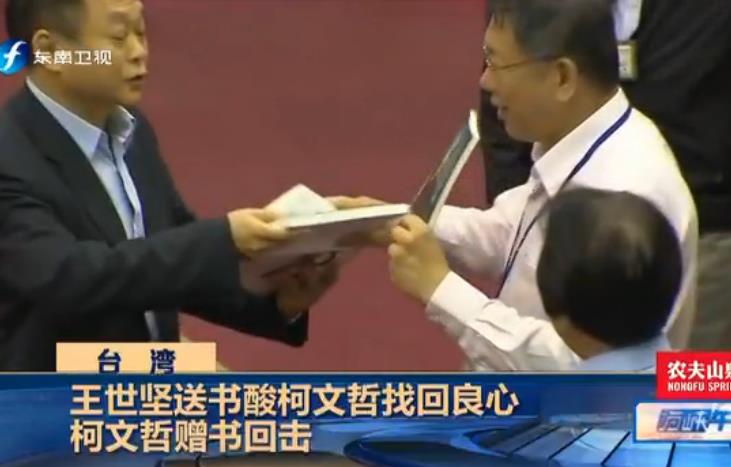 王世坚与柯文哲互相赠书。(图片截取自东南卫视视频)