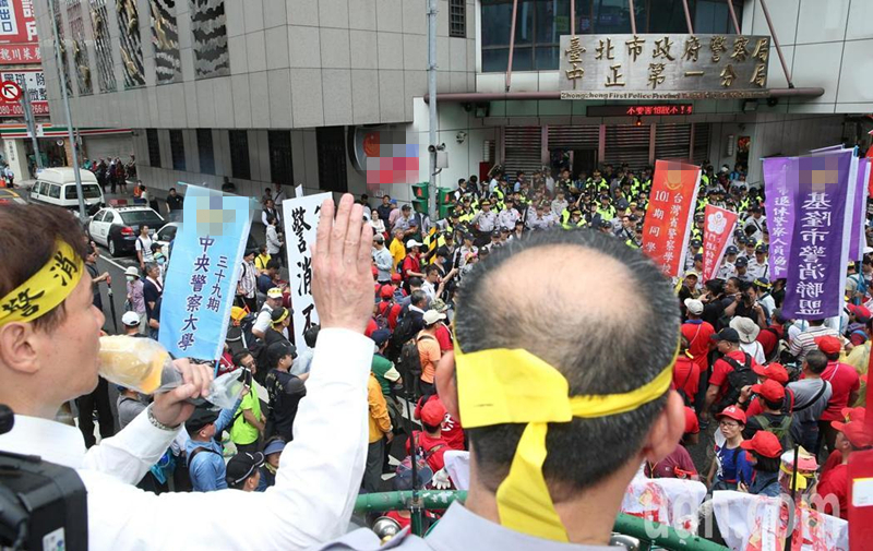 退休警消反年改团体,24日持续上街头,在“立法院”中山南路周边集结游行抗议。因不满警方处理态度一度包围中正一分局,双方发生推挤。(图片来源:台湾《联合报》)