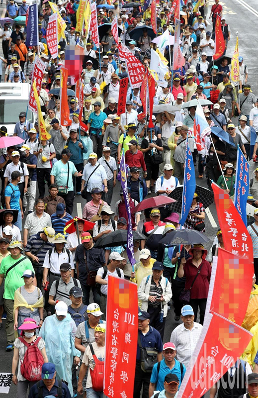 退休警消反年改团体,24日持续上街头,在“立法院”中山南路周边集结游行抗议。(图片来源:台湾《联合报》)