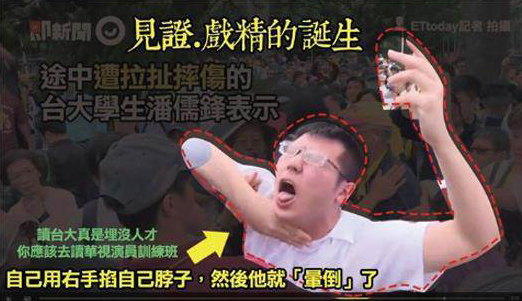 中国台湾网5月5日讯 为反对蔡英文当局违法乱政,强行拔出“颜色不对”的管中闵当选校长资格,台大自主联盟4日发起“新五四运动”,校内“挺管”、“反管”的力量也爆发冲突。台湾“中时电子报”报道,“反管”阵营的台大资管系学生潘儒锋声称,冲突中,他被人从后拉扯勒住以致摔倒。不过,随后曝光的冲突影片却显示,其是自己用手掐脖子而后倒地,进而被网友群起遭讽。“你这么好骗,你家里人知道吗?”Facebook粉丝页发图笑说:见证戏精诞生!自己用手掐脖子、自己倒地,谢谢潘同学为我们带来这么有创意的表演,来宾请给分。