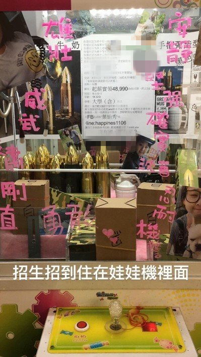 娃娃机里就有招募信息,还有负责女士官的军装照与脸谱网、line联络方式。(图片取自台媒)