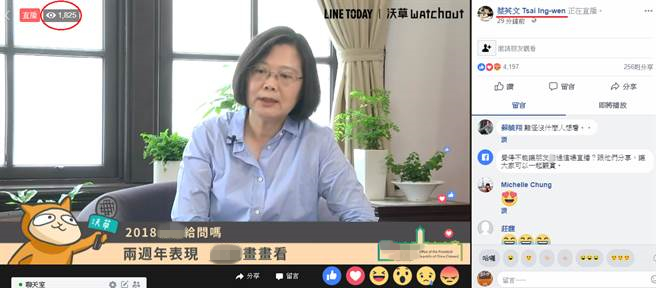 蔡英文最近可以说是很喜欢开直播了。据台湾《中时电子报》报道,5月20日是蔡执政两周年,她首度接受网媒“沃草”在线直播活动,但全台2300万人仅有1825人观看。网友讽刺,民调低成这样不是没有原因。