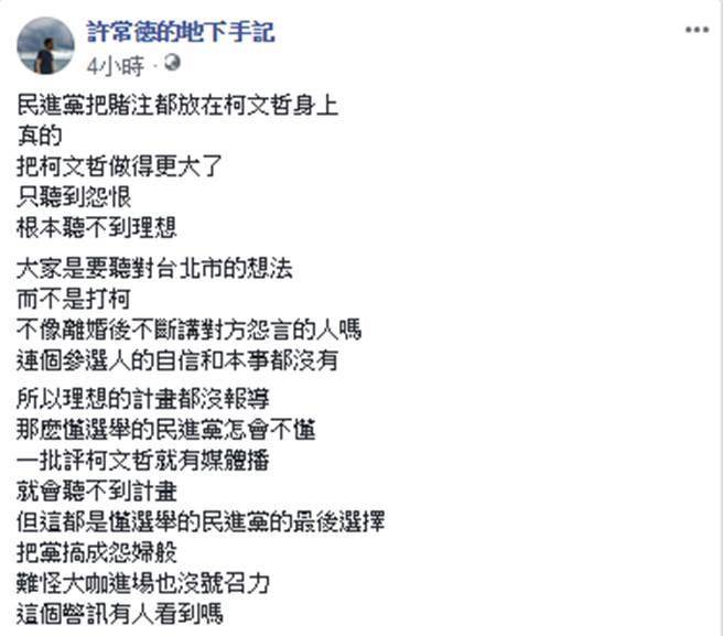 许常德表示选民想知道的,是民进党如何经营台北市的政见,而不是只会一味地“打柯”,导致提出理想政见时总被忽略,只有批评柯P时才能博得版面,让他不解“那么懂选举的民进党怎会不懂”?感叹民进党把柯P做大之后,等同把自己搞得如同深宫怨妇,连请到大咖站台也没有号召力,不禁反问“这个更警讯有人看到吗”?